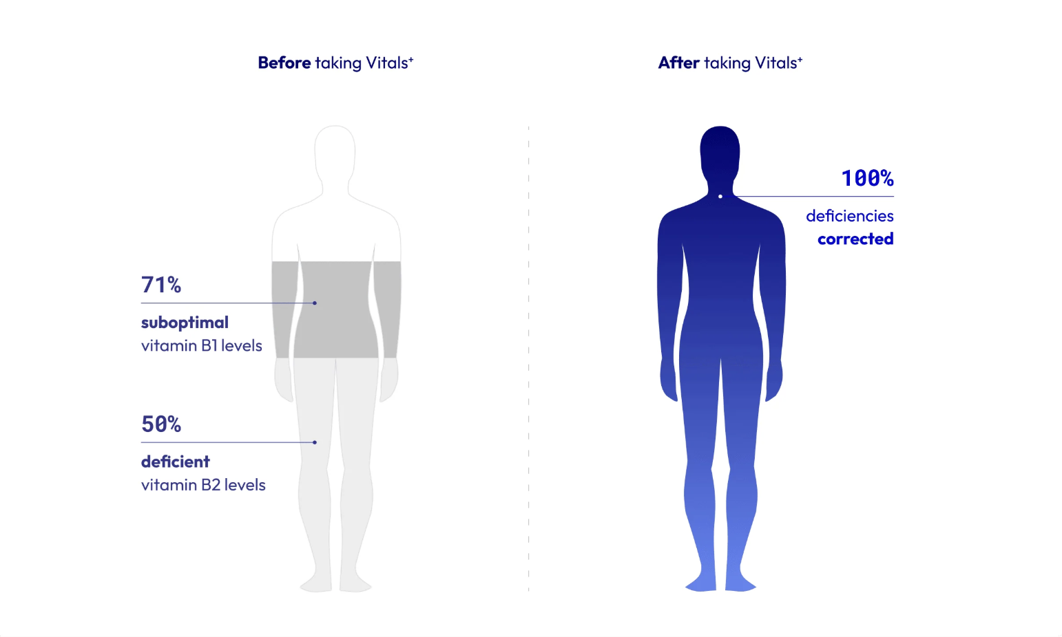 Over 8 months, participants took Vitals⁺ daily. Before and after the intervention, we measured:
