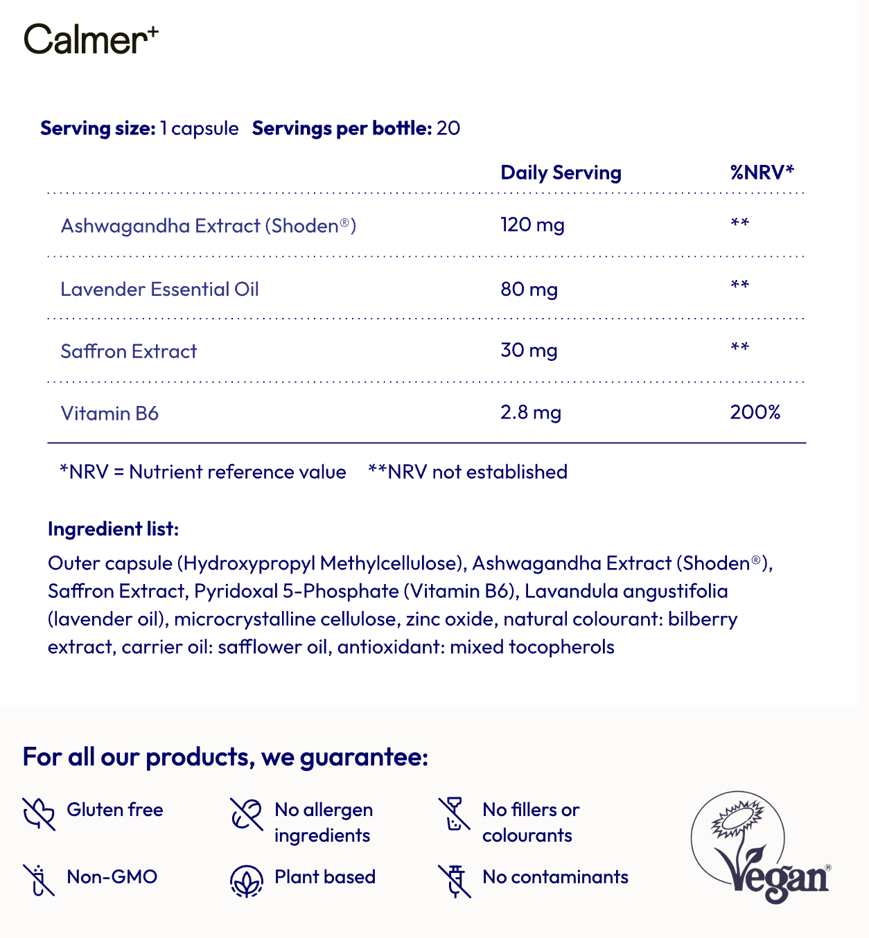 ✅ In short: Calmer⁺ is made with four powerful, natural ingredients – lavender oil, Shoden® ashwagandha, saffron extract, and vitamin B6 – carefully blended to support calm and clarity, whenever you need it.