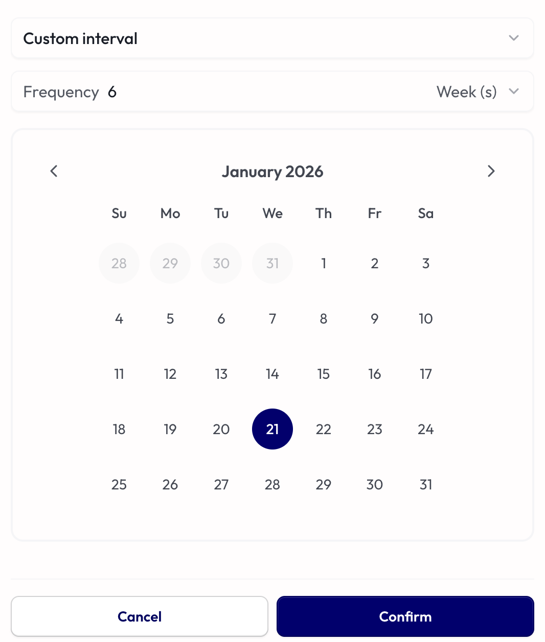The default is every 29 days. Want something different? Create a custom schedule by entering your preferred number of days, weeks, or months